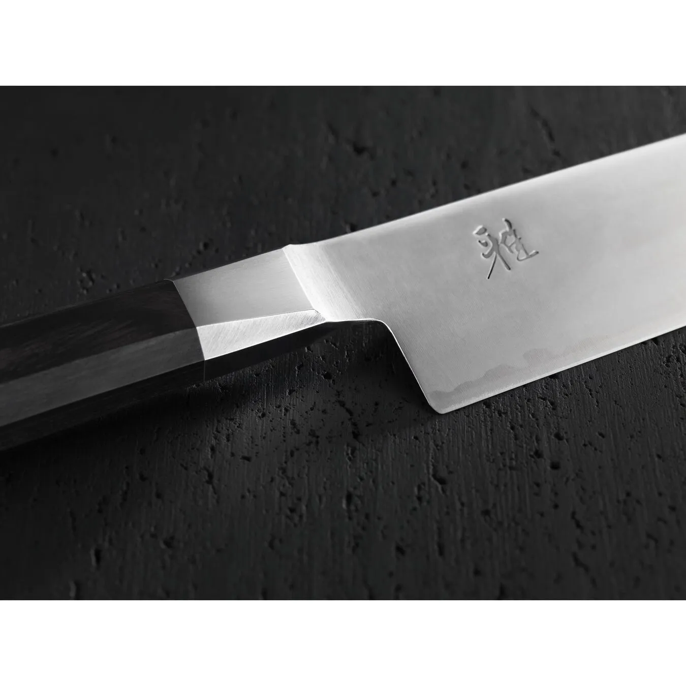 Wenn du hohe Erwartungen an deine Messer hast, liegst du mit diesem hochwertigen Messer genau richtig und kannst dich auf Qualität, Schärfe und ergonomisches Design freuen. Das Gyutoh von MIYABI ist ein japanisches Kochmesser und ideal für verschiedenste Schneidarbeiten in der Küche, wie wie zum Beispiel das Schneiden von Fleisch, Fisch und Gemüse. Der fugenlos verarbeitete Griff aus Pakkaholz ist ergonomisch geformt, sodass das Küchenmesser besonders angenehm in der Hand liegt. Die Klinge wurde mit dem Honbazuke Abzug geschliffen. Bei diesem Verfahren der klassischen japanischen Messerfertigung wird die Klinge in drei Schritten geschärft und poliert, wodurch die Schneide durch ihre feine Oberfläche besonders scharf wird. Die FRIODUR Klinge aus Edelstahl wird eisgehärtet. Das Ergebnis ist ein Messer, das besonders scharf und korrosionsbeständig ist. Das Messer wurde in Seki gefertigt, dem japanischen Zentrum der Schwerter- und Messerindustrie. Es vereint deutsche Ingenieurskunst und japanische Handwerkskunst.
