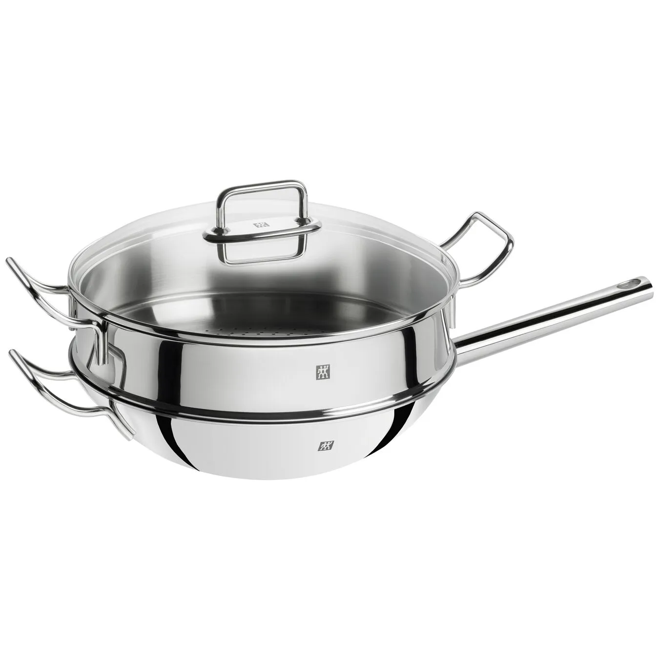 Dämpfen ist ein schonendes Verfahren, mit dem vor allem Gemüse gegart wird. Es behält dann besonders gut Form, Farbe und Geschmack. Auch bleiben wertvolle Vitamine besser erhalten, wenn das Gargut nicht mit Wasser in Kontakt kommt. Der Dämpfeinsatz für den Wok mit 32 cm Durchmesser besteht aus rostfreiem Edelstahl mit High-Gloss-Oberfläche und Griffen, die beim Kochen kühl bleiben, sodass Sie den Einsatz jederzeit herausnehmen können. Füllen Sie Wasser oder Gemüsebrühe in den Wok und geben Sie das Gemüse oder anderes Gargut in den Dämpfeinsatz. In der asiatischen Küche können dies auch Fisch, Fleisch oder Nudeln sein. Der Edelstahl gibt die Wärme sanft an das Gargut weiter, sodass gegartes Gemüse seinen natürlichen Geschmack nicht verliert. Zum gesunden Kochen trägt auch bei, dass beim Dämpfen keinerlei Fett benötigt wird. Bei verschlossenem Deckel ist das Dämpfen besonders effektiv. Wärme und Feuchtigkeit bleiben erhalten, was die Zeit für das Garen verkürzt. Nach der Verwendung ist es sehr leicht, den Einsatz zu reinigen. Die glatte Oberfläche ist pflegeleicht und spülmaschinengeeignet. Der Einsatz komplettiert Ihr Küchenrepertoire. Mit dem Dämpfeinsatz von ZWILLING® Plus ist die gesunde Küche keine Schwierigkeit mehr und gesunder Fisch oder Gemüse gelingt Ihnen im Handumdrehen, wobei Vitamine erhalten bleiben.