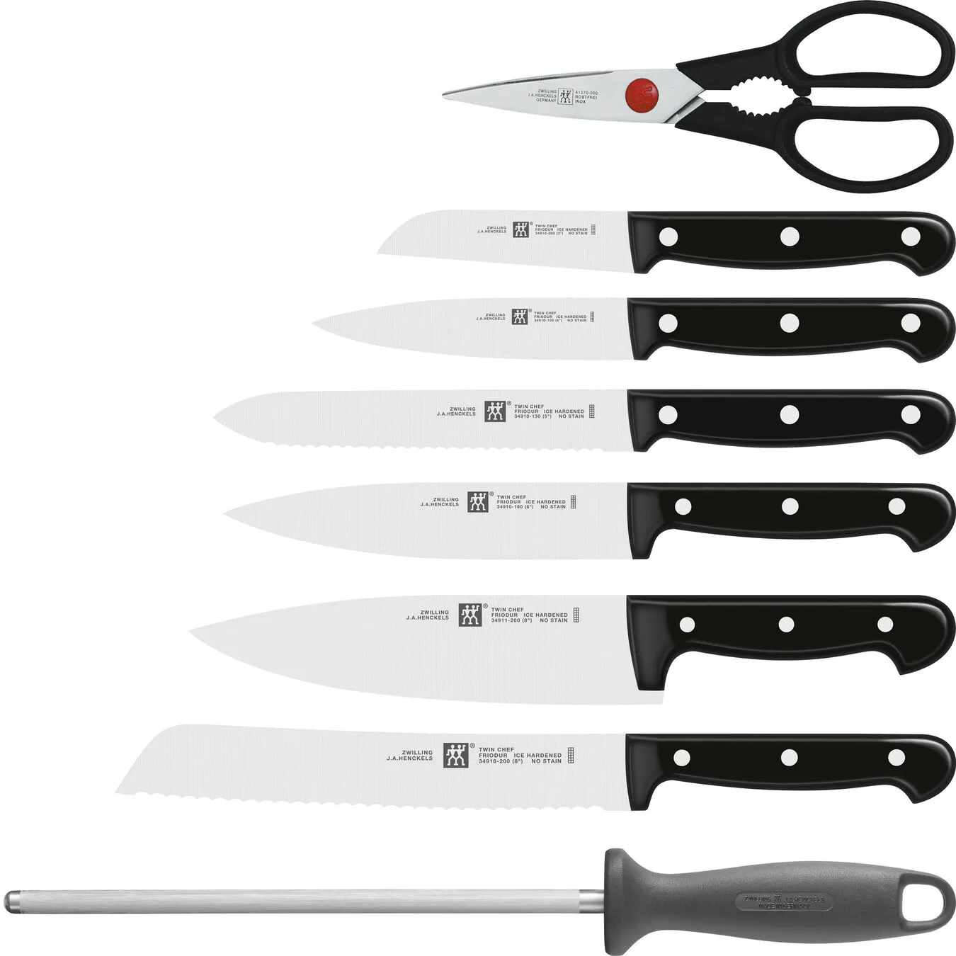 - Enthält 1 Gemüse- (8 cm), 1 Spick- und Garniermesser (10 cm), 1 Universal- (13 cm), 1 Fleisch-(16 cm), 1 Koch- (20 cm), 1 Brotmesser (20 cm), 1 Wetzstahl (23 cm), 1 Vielzweckschere und 1 Messerblock