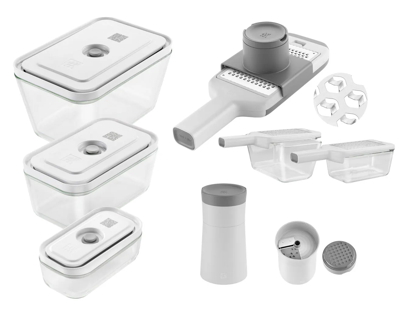 Dieses Set ist dein neues Dreifach-Pro für frisches Buntes. Denn es beinhaltet eine ZWILLING Z-Cut Multi-Reibe mit scharfer Zwei-Wege-Reibetechnologie, einen ZWILLING Z-Cut Spiralschneider für feine Obst- und Gemüsenudeln und die ideal dazu passenden Frischhalteboxen. Letztere eignen sich ideal, um frisch zubereitete Zutaten und Gerichte bis zu fünfmal länger frischzuhalten im Vergleich zur herkömmlichen Aufbewahrung ohne Vakuum. Die drei S, M, L-Boxen von ZWILLING FRESH & SAVE sind der ideale Ort für die frische Karotten- oder Gurkenpasta, die du kinderleicht mit dem 4-in-1-Spiralschneider im Set zubereiten kannst. Das formstabile, spülmaschinengeeignete Schneidgerät aus 18/10-Edelstahl zaubert dir leckere Spiralnudeln aus Obst, Gemüse und Rohkost für Beilagen, Garnituren oder Nachspeisen. Die ideale Ergänzung zur 7-in-1-Multi-Reibe, die ebenfalls Teil des Sets ist. Mit ihr kannst du raspeln, hobeln, reiben und schneiden – alles stets formstabil, mit Anti-Rutsch-Pads und kompatibel zu deinen ZWILLING FRESH & SAVE Boxen M und L. So geht frische Küche einfach und lecker!